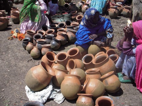 In every town (pretty much) in Ethiopia there is a day or a few days where people come together to show of their products and sell supplies to the local community. For example my town has two, a small one on Wednesday, and a large one on Saturday. They sell everything from fruits and vegetables, to livestock, to clay pots and even manure. Usually depending on what the product you can save as much as 1/3 the price you would pay for things in town. Eggs in town are 2.50birr, at the market they are 2.00birr. Most of the town will at some point on Saturday end up at the market. It is where most people buy their weeks supplies of food. For me it is an excellent opportunity to see the local culture and my counterpart was in a very sharing mood this weekend. He pointed out different things that meant people were looking to be married and explained different styles of dress among other things. The first picture is of some hand made clay pots, as well as hand made Jebanahs (coffee pots). These are made from the local clay around the river. The second is of spices, these are mostly collected locally, although some of them are imported from other parts of the country, as you can see some of these are very familiar to Americans, I can get cumen seeds, mustard seeds, rosemary, among other things. The third is some traditional Orthodox wraps. These are draped over the shoulders or wrapped around the heads as a traditional part of their religion. Next is some home made baskets, these are made to hold decorations as well as to use in sorting t’eff. It is required that as a way to symbolize a women is ready to marry that she be able to make these. Finally the last picture shows some Sudanese women. In the very bottom of the gulch some Sudanese have migrated, they are prominent for their clay making. They bring everything from pots, to injera pans for the injera making machines. They are easy to ID because of their different style of dressing.