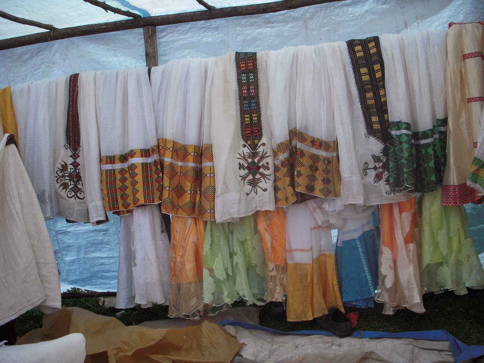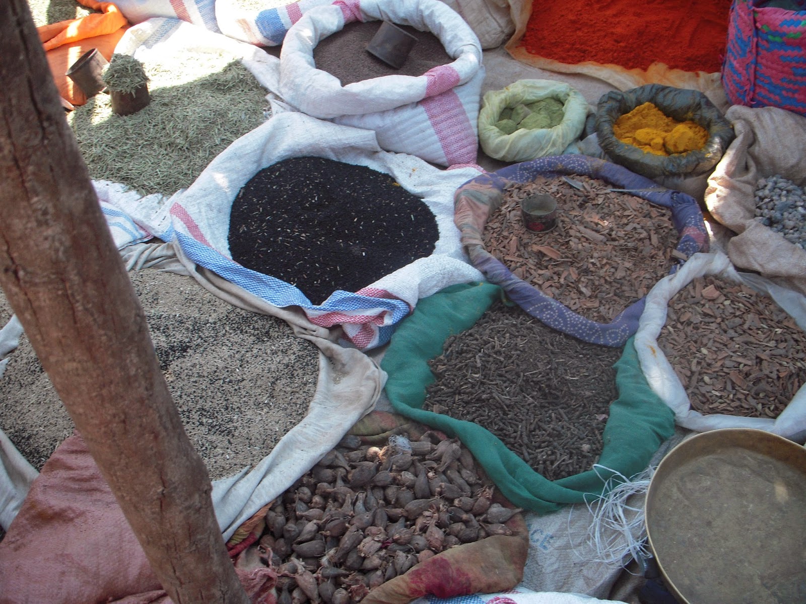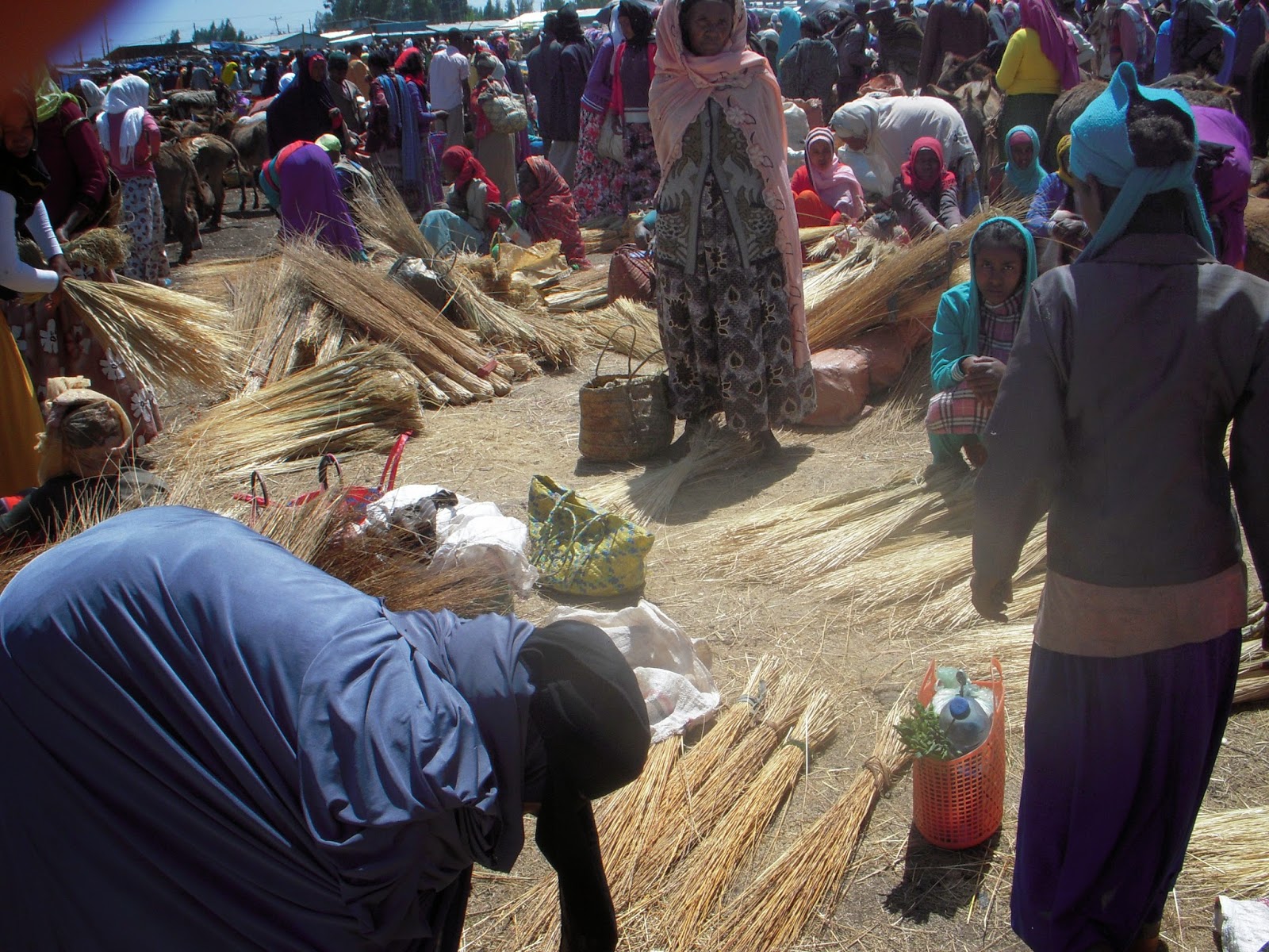 In every town (pretty much) in Ethiopia there is a day or a few days where people come together to show of their products and sell supplies to the local community. For example my town has two, a small one on Wednesday, and a large one on Saturday. They sell everything from fruits and vegetables, to livestock, to clay pots and even manure. Usually depending on what the product you can save as much as 1/3 the price you would pay for things in town. Eggs in town are 2.50birr, at the market they are 2.00birr. Most of the town will at some point on Saturday end up at the market. It is where most people buy their weeks supplies of food. For me it is an excellent opportunity to see the local culture and my counterpart was in a very sharing mood this weekend. He pointed out different things that meant people were looking to be married and explained different styles of dress among other things. The first picture is of some hand made clay pots, as well as hand made Jebanahs (coffee pots). These are made from the local clay around the river. The second is of spices, these are mostly collected locally, although some of them are imported from other parts of the country, as you can see some of these are very familiar to Americans, I can get cumen seeds, mustard seeds, rosemary, among other things. The third is some traditional Orthodox wraps. These are draped over the shoulders or wrapped around the heads as a traditional part of their religion. Next is some home made baskets, these are made to hold decorations as well as to use in sorting t’eff. It is required that as a way to symbolize a women is ready to marry that she be able to make these. Finally the last picture shows some Sudanese women. In the very bottom of the gulch some Sudanese have migrated, they are prominent for their clay making. They bring everything from pots, to injera pans for the injera making machines. They are easy to ID because of their different style of dressing.