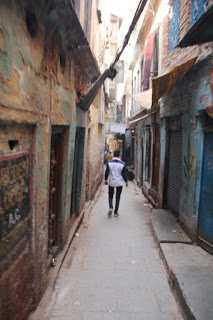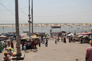 Anyway. Since I was here I figured I would get my sight seeing in.  I made my way to the Ghats, holy river water, and watched the people bathe themselves to receive the blessings. I then received an offer to sit down and before I realized what was happening I was being swinddled into receiving a blessing where the Bhrama tried to charge me 500 ruppees for something that at temples is done at no charge. I gave ten, half the cost of a bottle of water, and said thanks. Then I got lost for about two hours walking in what I swear could easily be considered an official maze. I ended up having to use a compass to find my way out.