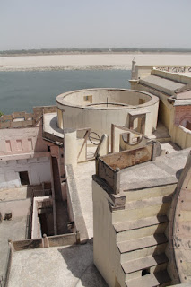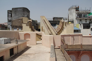 So today was a much better time that I have had since I got here.  The day was hot, but hey it is India in the dry season.  I spent the day lost, but not as lost as before.  I managed to see the Golden temple dedicated to Shiva (no photos allowed), more of the Ghats, as well as the Jantar Mantar (one of the earliest observatories in India).  I also managed to have a Lasi at the famous Blue lasi cafe’ (thick milk, with sugar and flavors like pineapple, mango, blue berry, banana, etc).  Finally I also let myself get suckered a little bit.  First I wanted to buy some necklaces from a street vendor.  The guy that got me was very nice and explained everything about the necklace, which god it was dedicated to, he even gave me a wrist band that he infused with his good karma.  Finally we got down to the price.  He started high, I mean REALLY high, and I managed to talk him down to about half his price and what I thought was a fairish foreigner deal.  Turns out I think I paid close to what Indians would pay for them, and I didn’t mind the extra because he was nice and made me laugh.  The second guy randomly was going the same direction down a street.  We started talking and he found out I was walking to a place near his shop.  So he had me stop in for some Chai tea and had his friend start the sales pitch.  I ended up walking out with a shirt, three scarves, and a purse for what amounts to about 20 USD.  He also walked me to the monument I wanted to see and never would have found on my own.